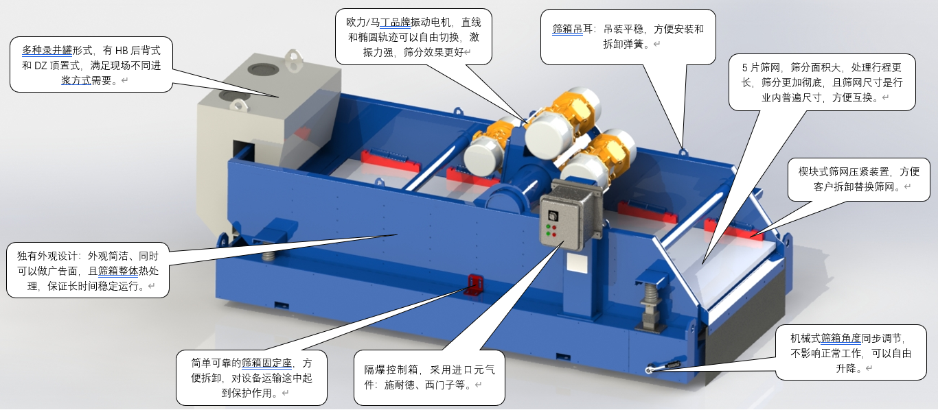 北鉆固控高頻干燥振動篩是結合國內外泥漿不落地市場需求及環保領域的要求自主研發的一款高激振強度的泥漿振動篩,高頻干燥振動篩能夠滿足各種鉆屑廢棄物脫水、篩分、凈化等要求。高頻干燥振動篩是保證整個鉆屑尾漿處理持續有效進行的必不可少的重要設備,直接將鉆井過程中振動篩、除砂器、除泥器排出的廢棄物進行干燥處理,干燥后可實現固相干堆處理。北鉆高頻干燥振動篩可根據客戶的不同處理要求進行特殊設計,以滿足國家對各類礦山,鉆探,水處理等工程的環保要求。 GBZS系列高頻干燥振動篩技術參數 型號 GBZS584 GBZS585/GBZS585S 振動軌跡 直線型/雙軌跡 處理量 140m³/h 165m³/h 電機功率 2×2.2kW/2x2.2+1x1.3kW 篩網數量 4 5 篩網規格 585×1165mm 585×1165mm 激振強度 ≥8.0G 雙振幅 5.0~6.5mm 篩箱調節角度 -1°~4° 噪音 <85db 防爆標準 ExdIIBt4/IECEX/A-TEX 重量 1530kg 1950kg 外形尺寸 3080×1960×1424mm 3597X1978X1415mm 備注 以上處理量供參考,依據不同的篩網目數和泥漿狀況會有不同。 GBZS系列干燥篩優勢圖示 北鉆高頻干燥振動篩的特點和優勢: 1.激振強度高達8.0G,而且可以調節,能夠有效的干燥鉆屑; 2.篩箱整體熱處理,能夠滿足高激振強度下長時間穩定工作; 3.電控箱內裝的熱繼電器有過載和缺相保護功能; 4.運動軌跡為直線型,振幅大,運動速度快,能快速的進行固液分離; 5.漏斗式進料方式的設計,有效的降低了進料高度,方便輸送機的進料; 6.采用國際知名品牌振動電機,意大利OLI電機或者美國Martin電機; 7.主要電器元件選用西門子,施耐德或者ABB等品牌;